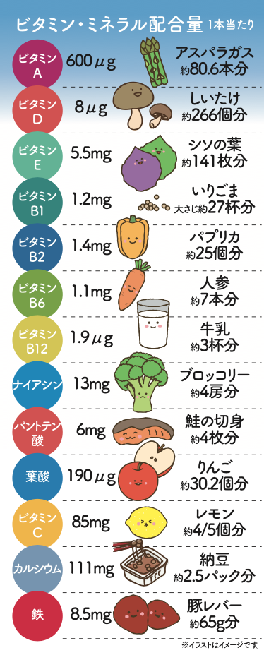 普段の生活で不足しがちな諸ビタミン類やカルシウムを補うことができます。健康補助食品として、1日に1本を目安にお飲みください。子どもはもちろんのこと、大人もお飲みいただけます。